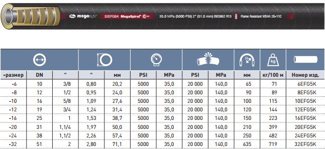ХАРАКТЕРИСТИКИ/ПРЕИМУЩЕСТВА До 40 % радиуса изгиба по EN 856 4SP/4SH при номинальном рабочем давлении. Исключительная гибкость. Превосходные эксплуатационные характеристики при импульсах и згибах: испытано на 1 000 000 импульсных циклов при 50 % радиуса изгиба по EN 856 R13 и SAE 100R13 (за исключением -32). Соответствует или превышает требования EN 856 4SP (от -10 до -32) и EN 856 4SH (от -20 до -32) к эксплуатационным характеристикам. Рукав EFG5K совместим с биоразлагающимися гидравлическими жидкостями типа синтетических эфиров, полигликолями, растительными маслами, а также жидкостями на базе нефти.