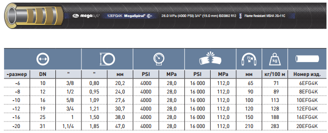 ХАРАКТЕРИСТИКИ/ПРЕИМУЩЕСТВА 40 % от радиуса изгиба по EN 856 4SP при номинальном рабочем давлении.Наиболее гибкий шланг EN 856 R12 / SAE 100R12 в промышленности. Превосходные эксплуатационные характеристики при импульсах и изгибах: испытано на 1 000 000 импульсных циклов при 50 % радиуса изгиба EN 856 R12 и SAE 100R12. Соответствует или превышает требования к эксплуатационным характеристикам стандарта EN 856 4SP (-16, -20).Рукав EFG4K совместим с биоразлагающимися гидравлическими жидкостями типа синтетических эфиров, полигликолями, растительными маслами, а также жидкостями на базе нефти.
