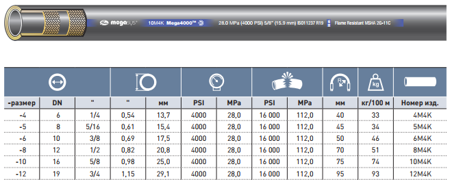 ХАРАКТЕРИСТИКИ/ПРЕИМУЩЕСТВА 50 % радиуса изгиба EN 857 2SC и 40 % радиуса изгибапо EN 853 2SN при расчетном рабочем давлении. Альтернатива спиральным рукавам в линиях высокого давления, где требуется гибкость. Превосходные эксплуатационные характеристики при импульсах и изгибах: испытано на 600 000 импульсных циклов. Соответствует требованиям к эксплуатационным характеристикам стандарта EN 857 2SC или превосходит их. Небольшой вес. Рукав M4K совместим с биоразлагающимися гидравлическими жидкостями типа синтетических эфиров, полигликолями, растительными маслами, а также жидкостями на базе нефти.