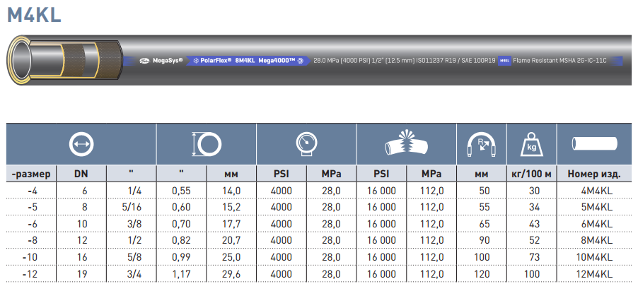 ХАРАКТЕРИСТИКИ/ПРЕИМУЩЕСТВА 70 % радиуса изгиба EN 857 2SC и 50% радиуса изгиба EN 853 2SN при расчетном рабочем давлении. Альтернатива спиральным рукавам в линиях высокого давления, где требуется гибкость. Соответствует требованиям к эксплуатационным характеристикам стандартов EN 857 2SC и EN 853 2SN или превосходит их. Небольшой вес.Рукав M4KL совместим с биоразлагающимися гидравлическими жидкостями типа синтетических эфиров, полигликолями, растительными маслами, а также жидкостями на базе нефти.